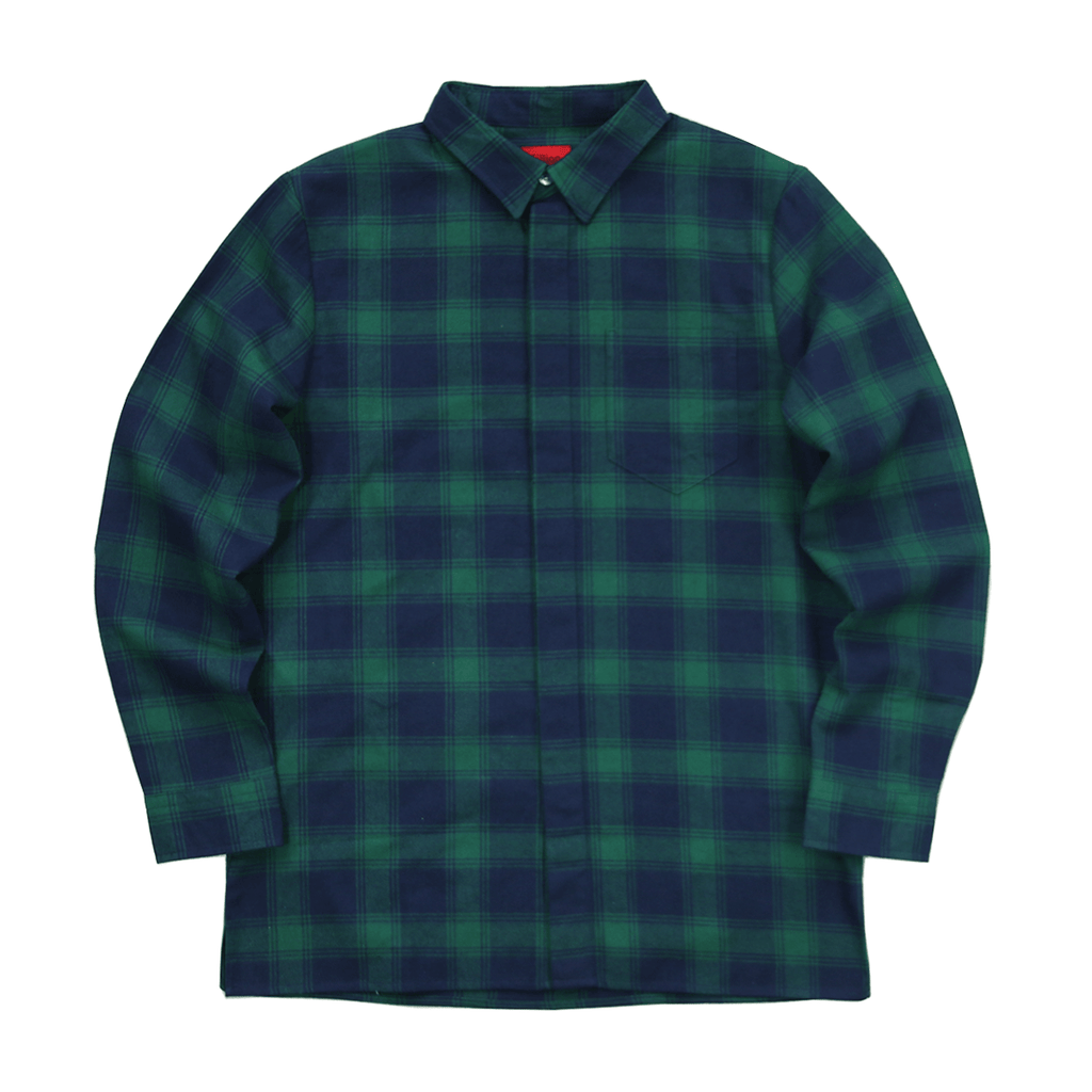 Medium-weight long sleeve button up shirt. It features hidden buttons and a flat-hem all around.