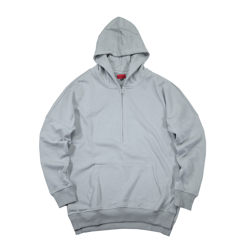 This quarter zip hoodie is made from medium-weight premium French Terry. It features a dropped shoulder design, kangaroo pouch pocket, and a side cut detail with an extended back.