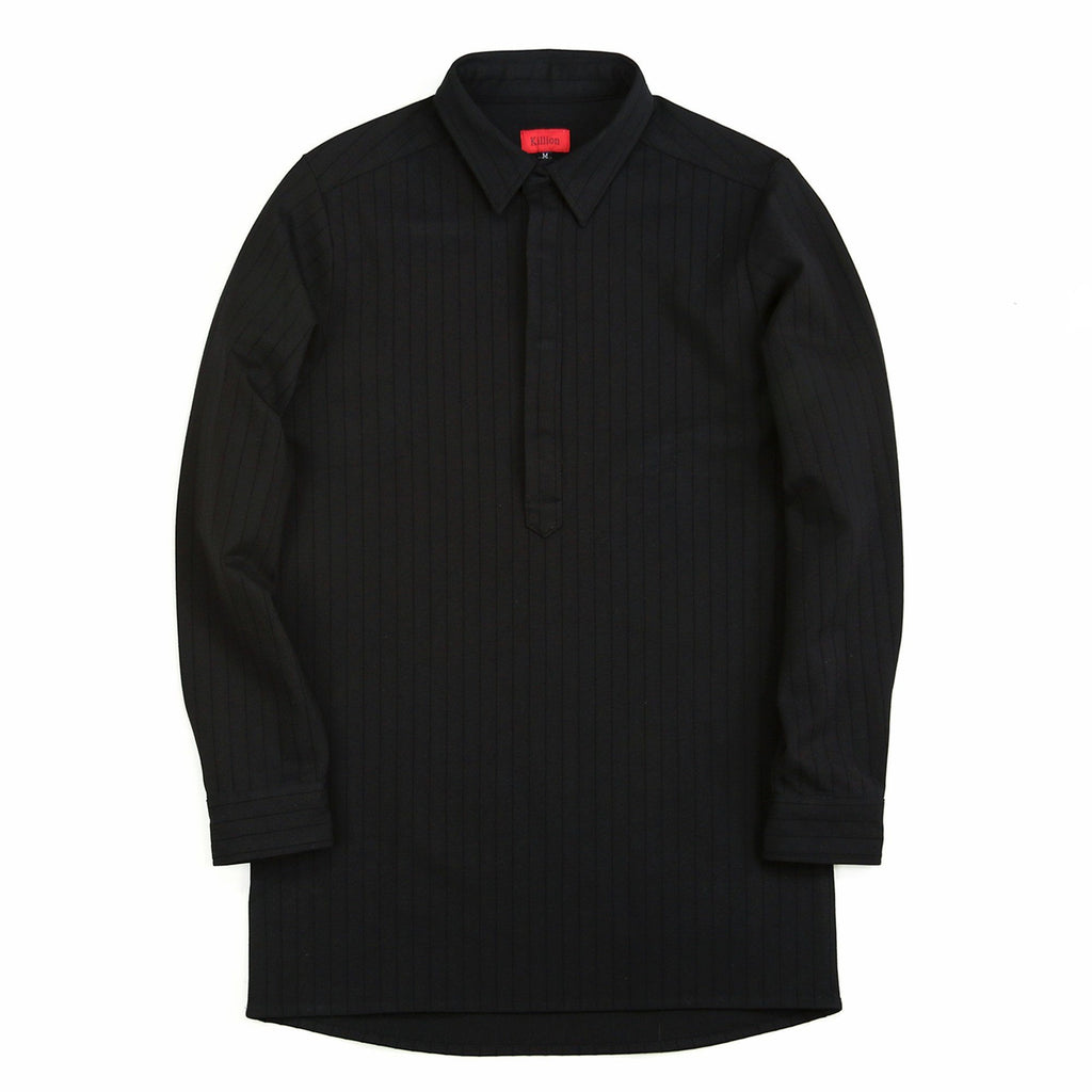 A premium collared shirt with a half-placket detail. Constructed from a technical ponte knit material with an interwoven striped texture. Features hidden snap buttons on the placket and an extended back design.