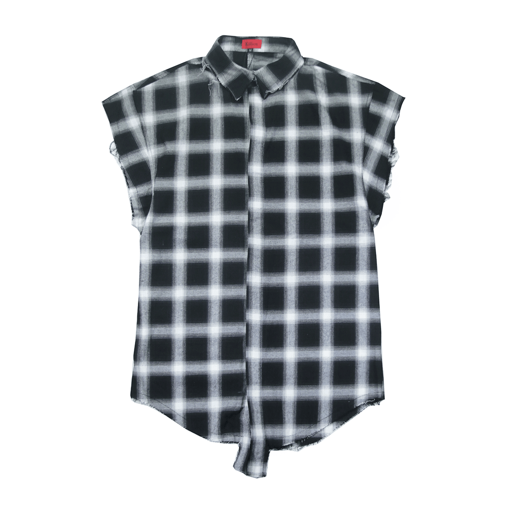 A comfortable lightweight cotton flannel shirt with "cut-off" sleeves and raw edges for a modern updated look. Designed to add a unique layering piece for the warm weather to come. Features a left chest pocket and hidden buttons with an extended back hem.