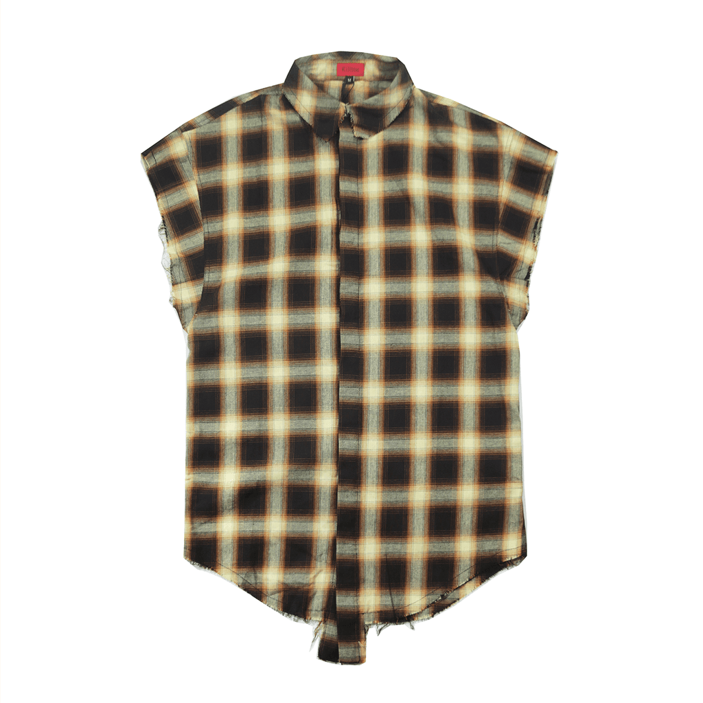 A comfortable lightweight cotton flannel shirt with "cut-off" sleeves and raw edges for a modern updated look. Designed to add a unique layering piece for the warm weather to come. Features a left chest pocket and hidden buttons with an extended back hem.