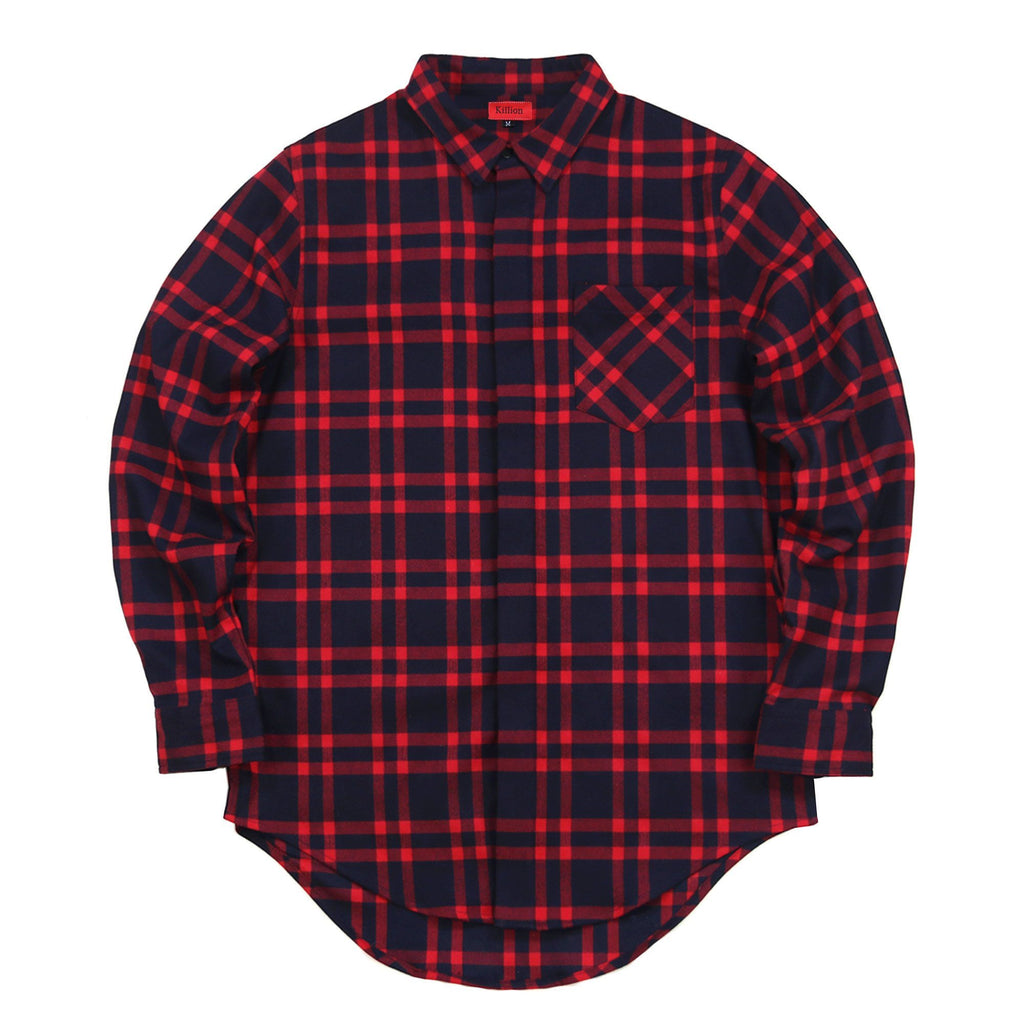Lightweight long sleeve button up shirt. It features hidden buttons, a scalloped hem, and a slightly extended back.
