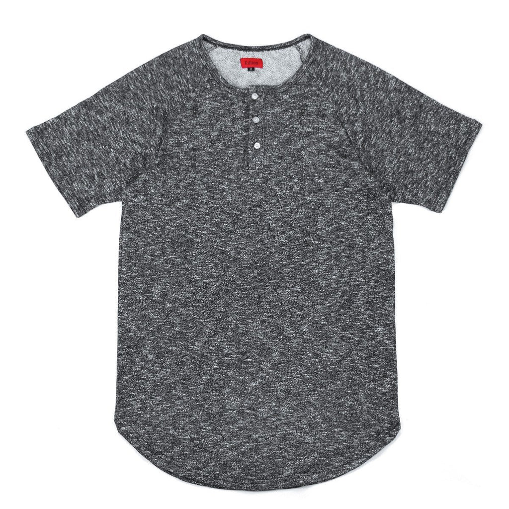 A slightly elongated premium top made from light-medium weight French Terry. It has a raglan sleeve cut, a henley neck detail, and a scoop designed hem.