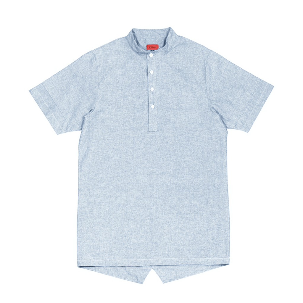 Crafted from high quality chambray sourced from Japan, the Hensworth is a lightweight top combining comfort and style. Details include a grandad collar over a henley, tonal striped sleeves, and a fishtail. It fits true-to-size with an accomplished slim-cut. Enjoy. This Product will provide a chambray blue-ish hue under cooler lighting.