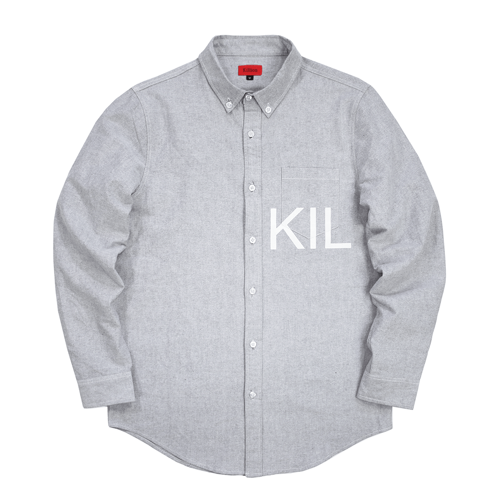 Lightweight oxford long sleeve button down shirt. Features our "KIL" logo print across front chest pocket, and a scalloped hem with a slightly extended back.