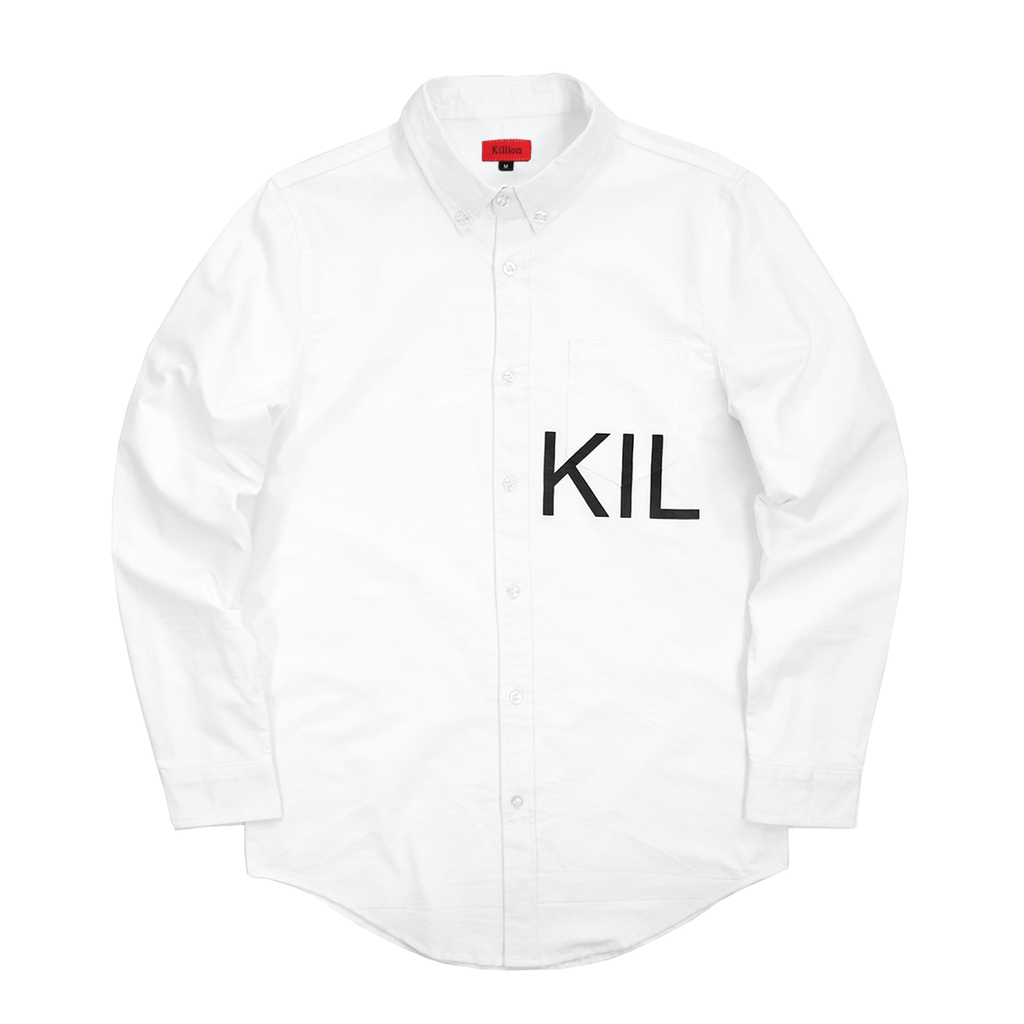 Lightweight oxford long sleeve button down shirt. Features our "KIL" logo print across front chest pocket, and a scalloped hem with a slightly extended back.