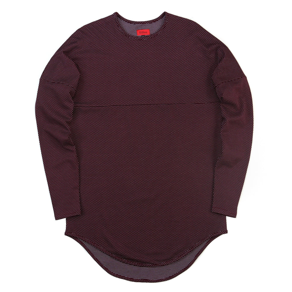 Poly-blend shirt with a dotted pattern. Features a layered chest detail with a dropped shoulder effect. This item has a scallop hem with taped edge details.