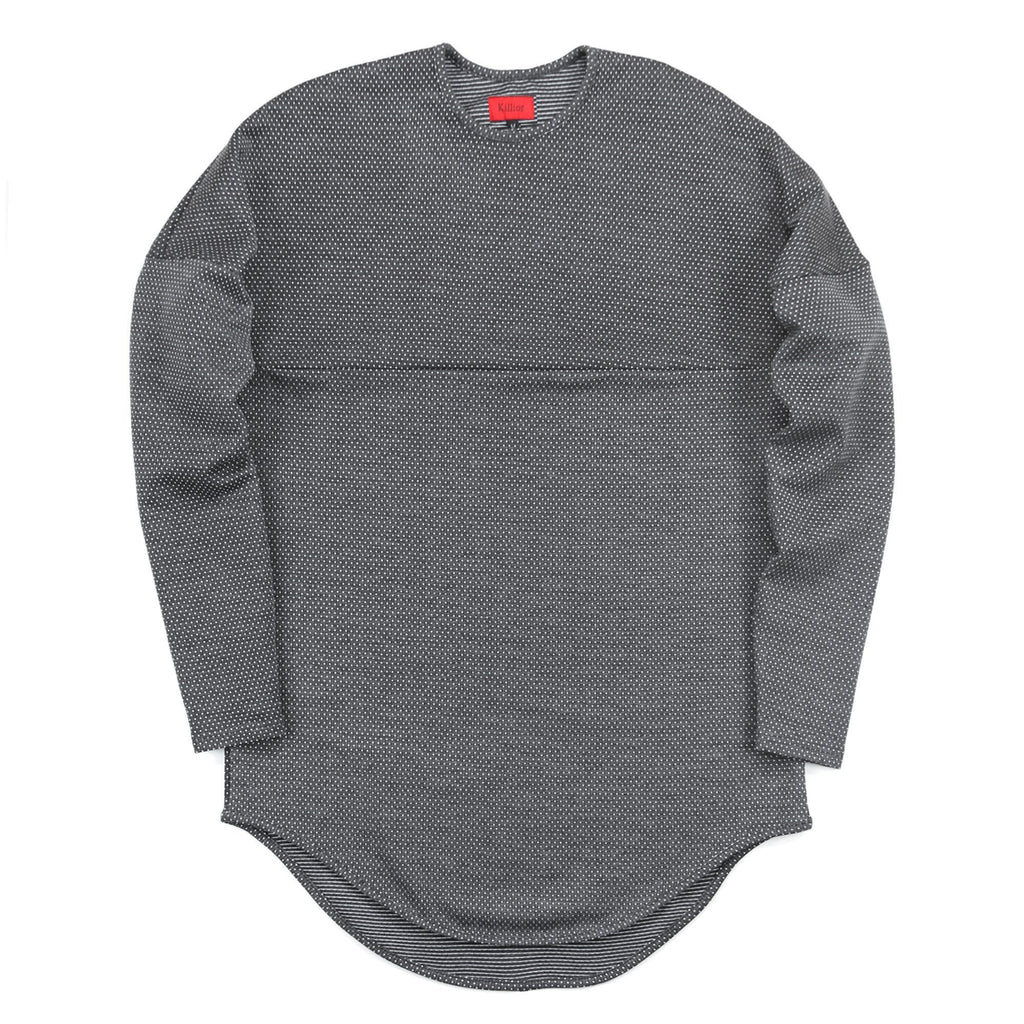 Poly-blend shirt with a dotted pattern. Features a layered chest detail with a dropped shoulder effect. This item has a scallop hem with taped edge details.