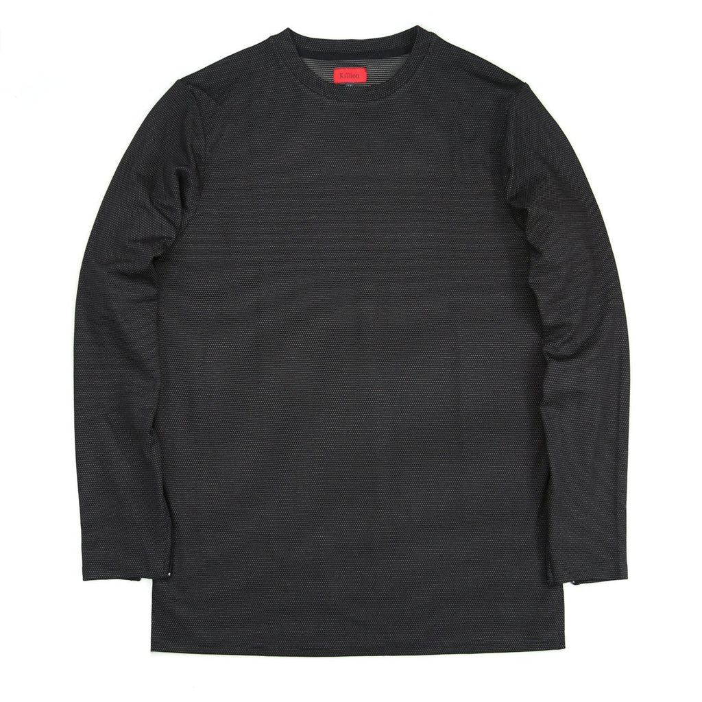 A medium weight garment perfect for layering or by itself. It is constructed from a roma tech fabric with a micro-dot pattern. It features zippers on the inner-cuffs and a split side hem.