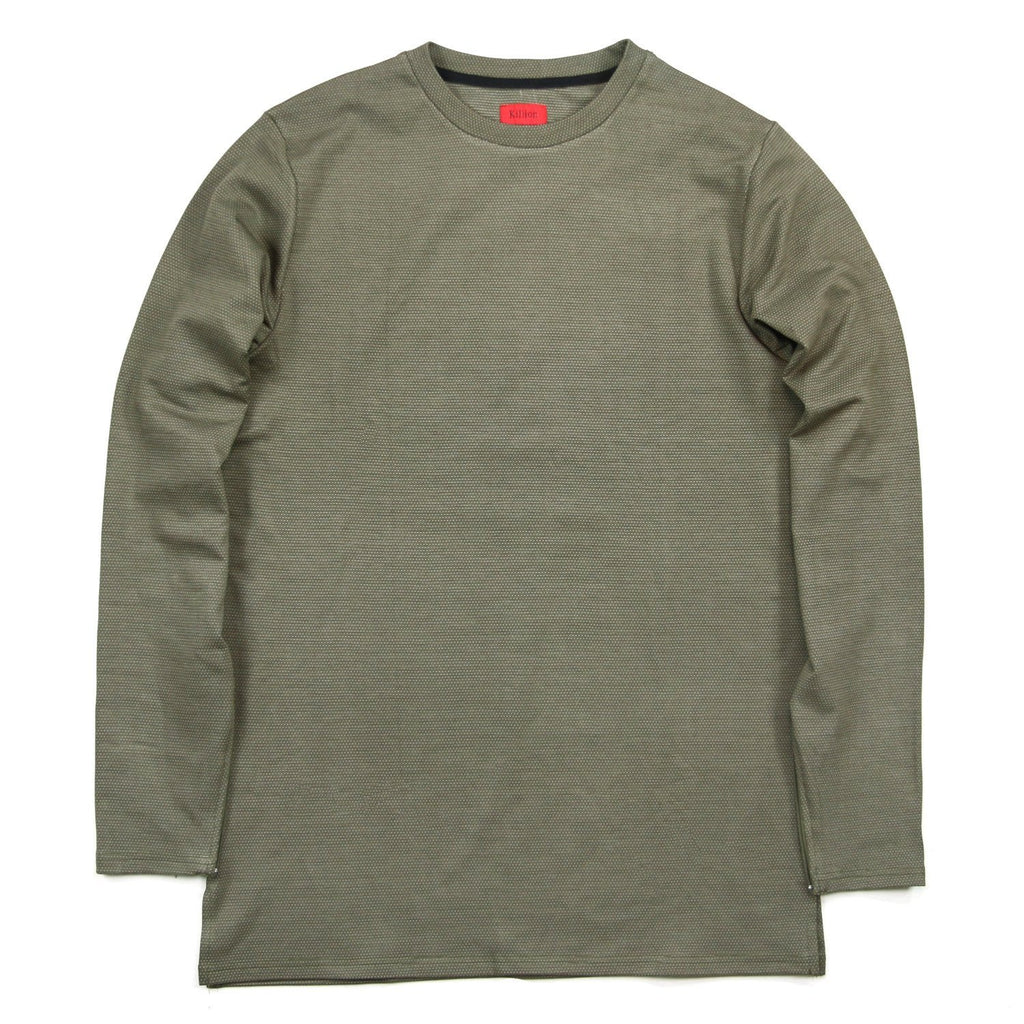 A medium weight garment perfect for layering or by itself. It is constructed from a roma tech fabric with a micro-dot pattern. It features zippers on the inner-cuffs and a split side hem.