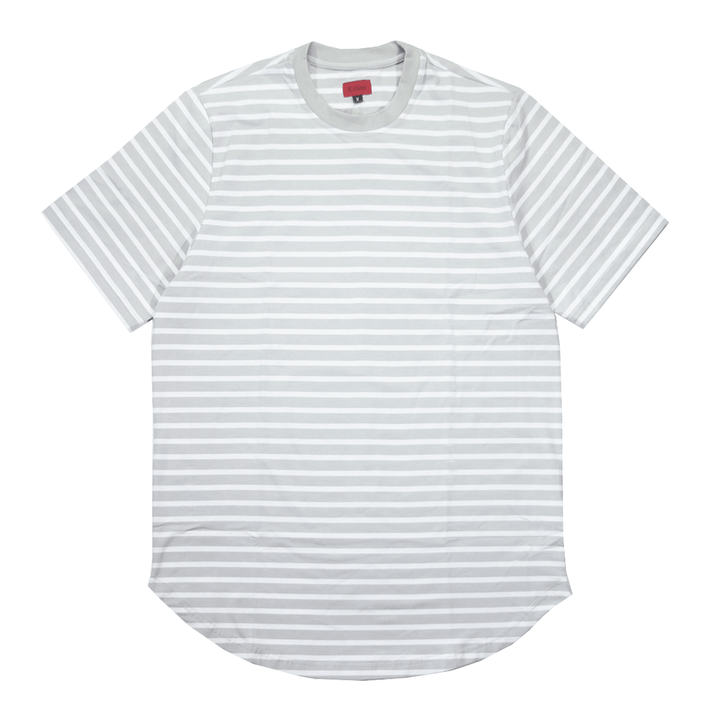 Striped cotton blend material. True comfort and style. Features a contrast neck ribbing and unique scooped bottom hem for detail. Stay true to size for the updated modern fit with a nice length or size up for an oversized drape look and styling.