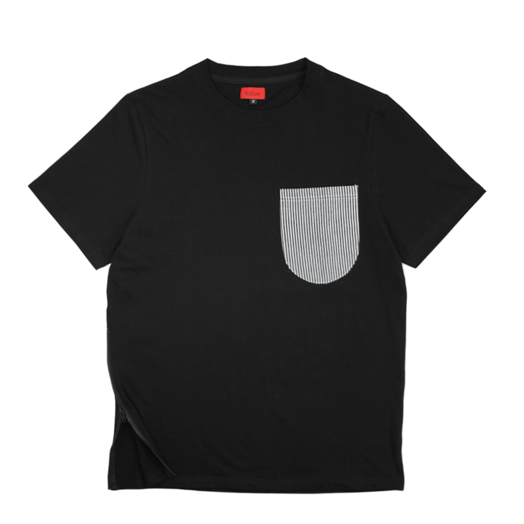 Mid-weight boxy fit tee with woven railroad stripe oversized pocket at left chest and black side seam zip on right.