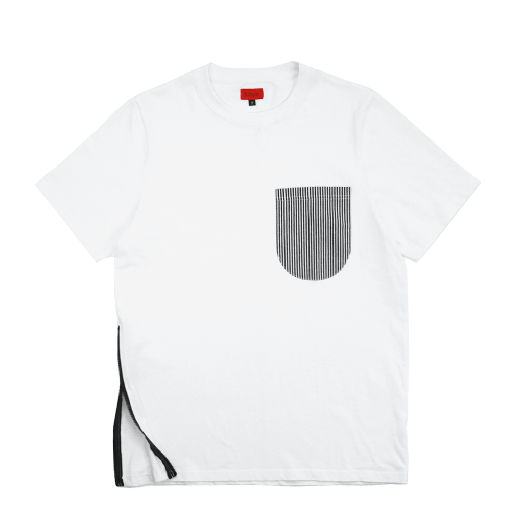 Mid-weight boxy fit tee with woven railroad stripe oversized pocket at left chest and black side seam zip on right.