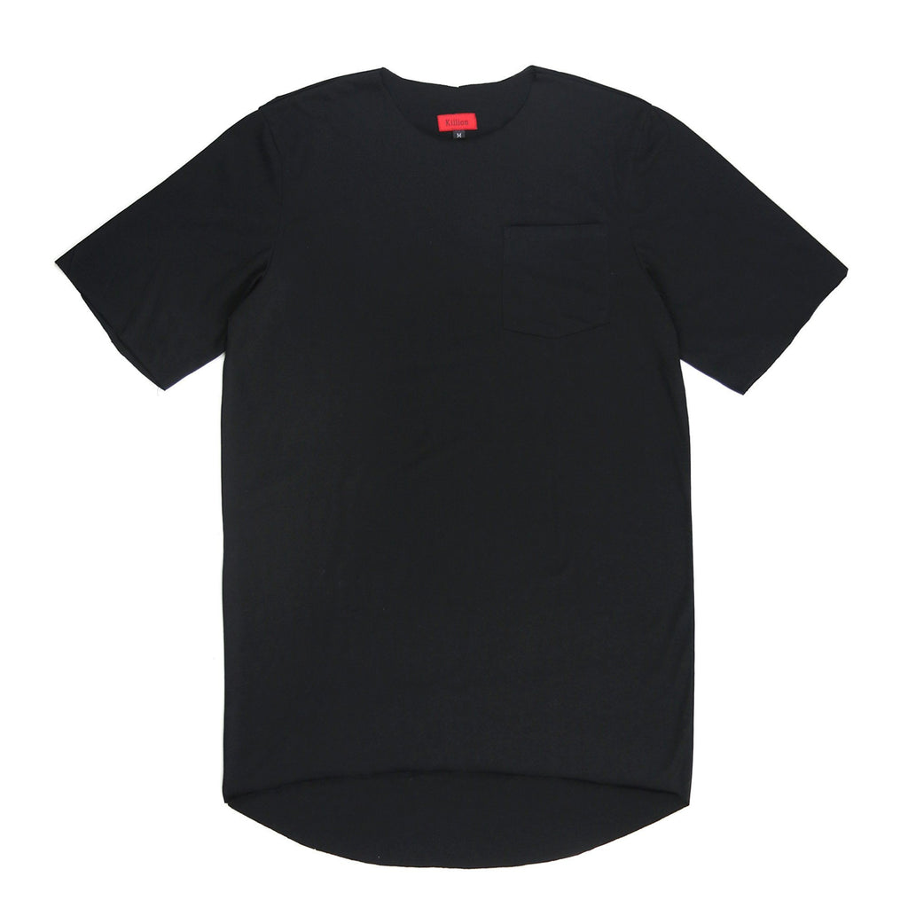 An essential pocket shirt treated with unfinished edges. It has a raw neck, raw sleeves, and raw bottom hem. It also features an extended deep scoop back.