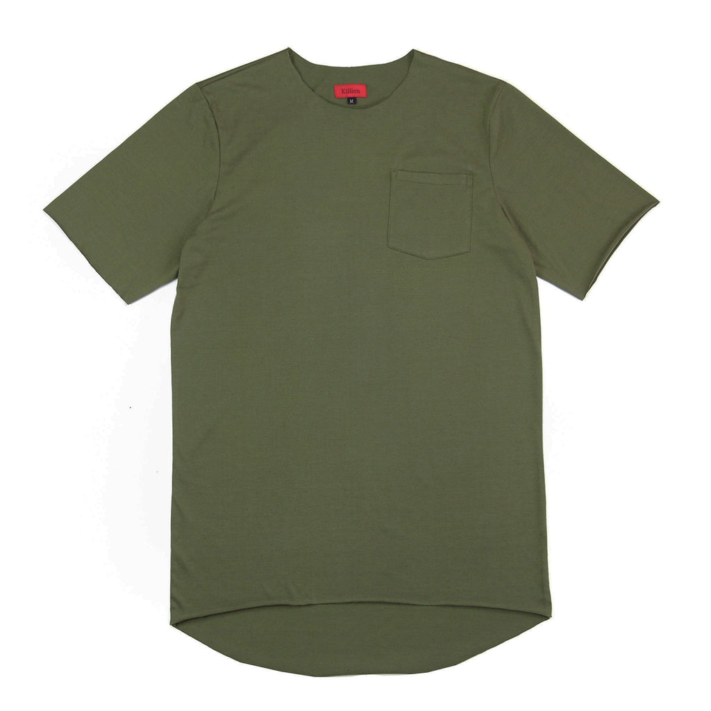 An essential pocket shirt treated with unfinished edges. It has a raw neck, raw sleeves, and raw bottom hem. It also features an extended deep scoop back.