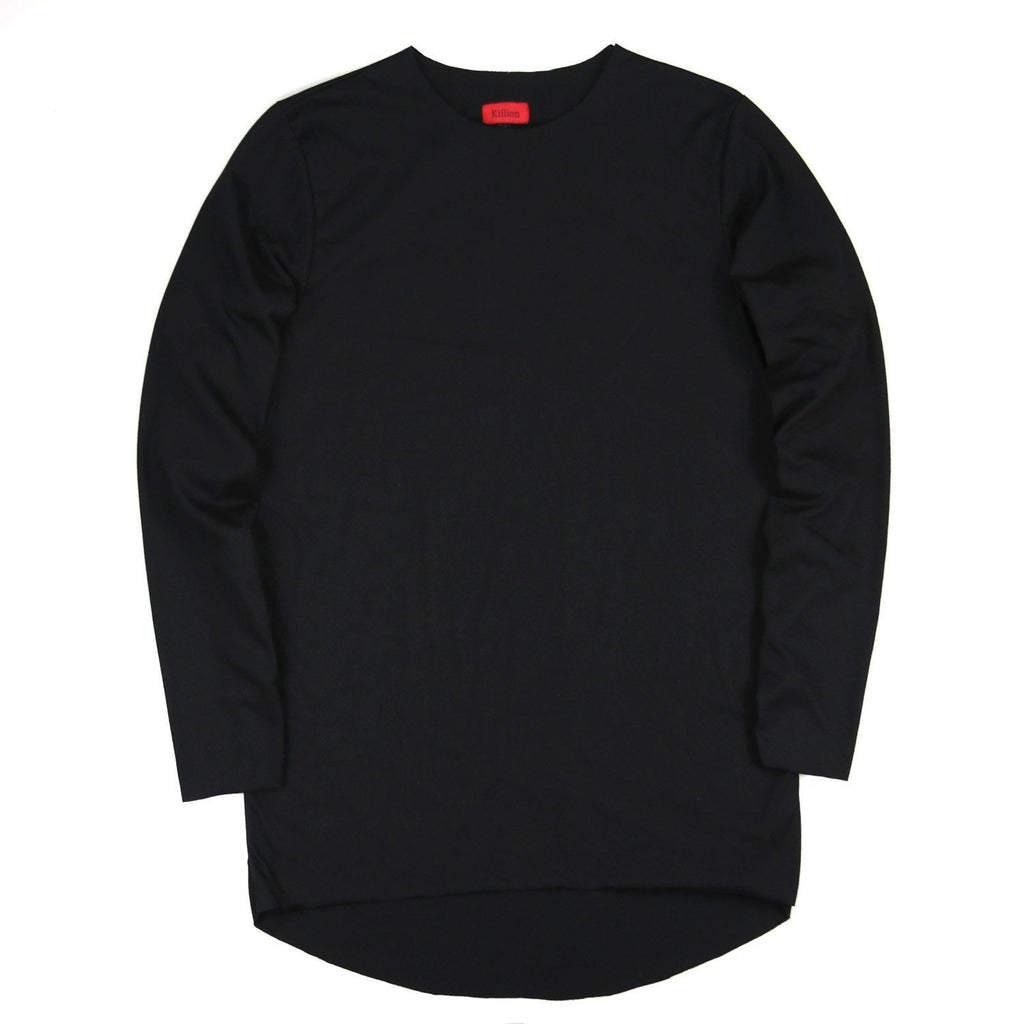 Raw collar, raw cuffs, raw hems. Made with 160g cotton blend. Features a scoop elongated back.