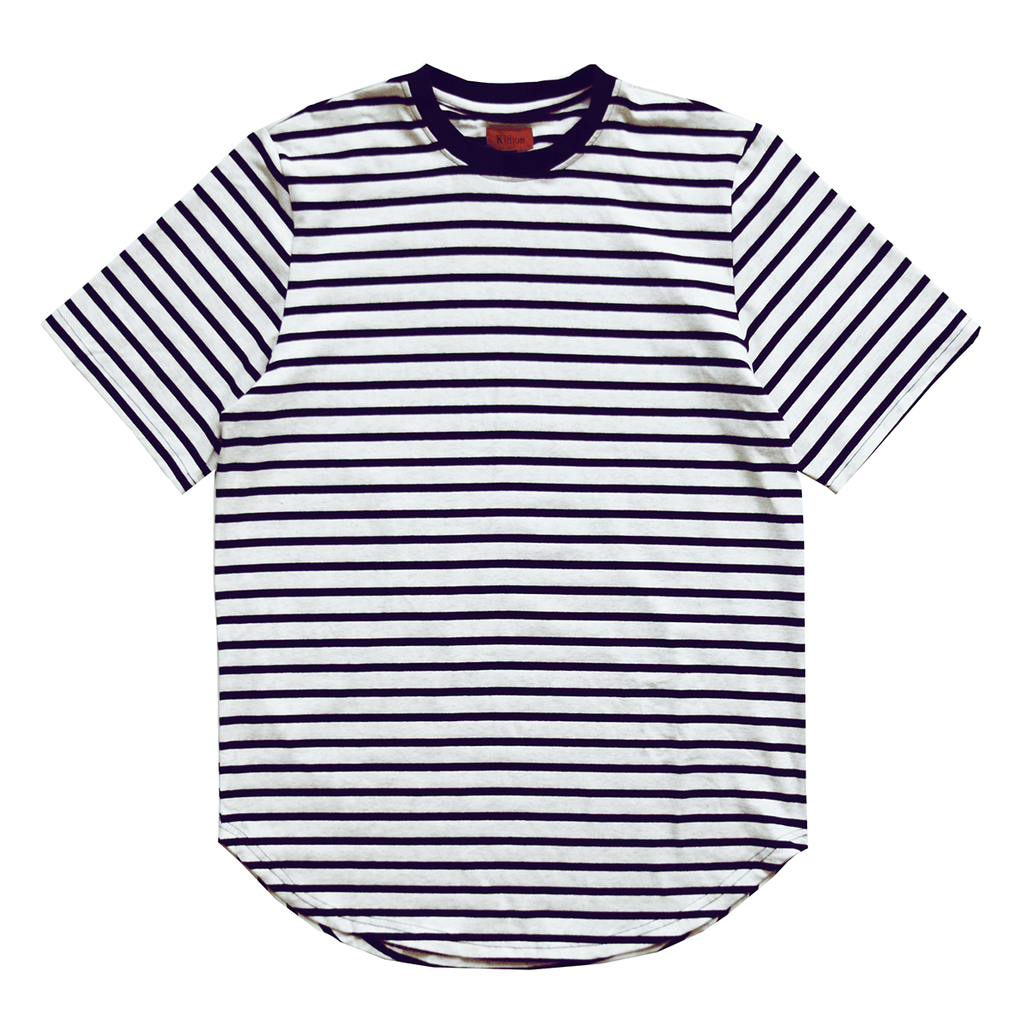 Striped cotton blend material. True comfort and style. Features a contrast neck ribbing and unique scooped bottom hem for detail. Stay true to size for the updated modern fit with a nice length or size up for an oversized drape look and styling.