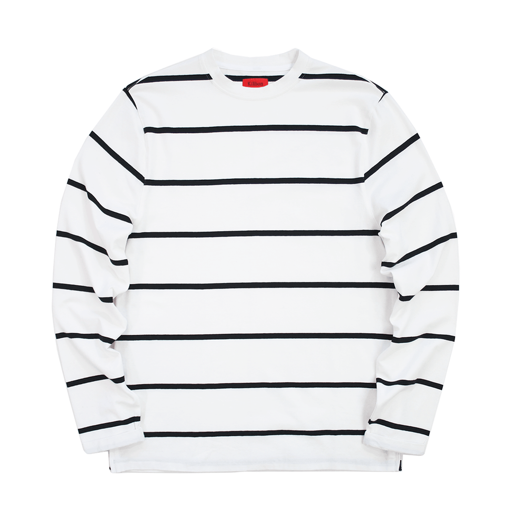 Cotton blend long sleeve shirt in wide stripe pattern, featuring hidden side seam zips on both sides and flat hem.